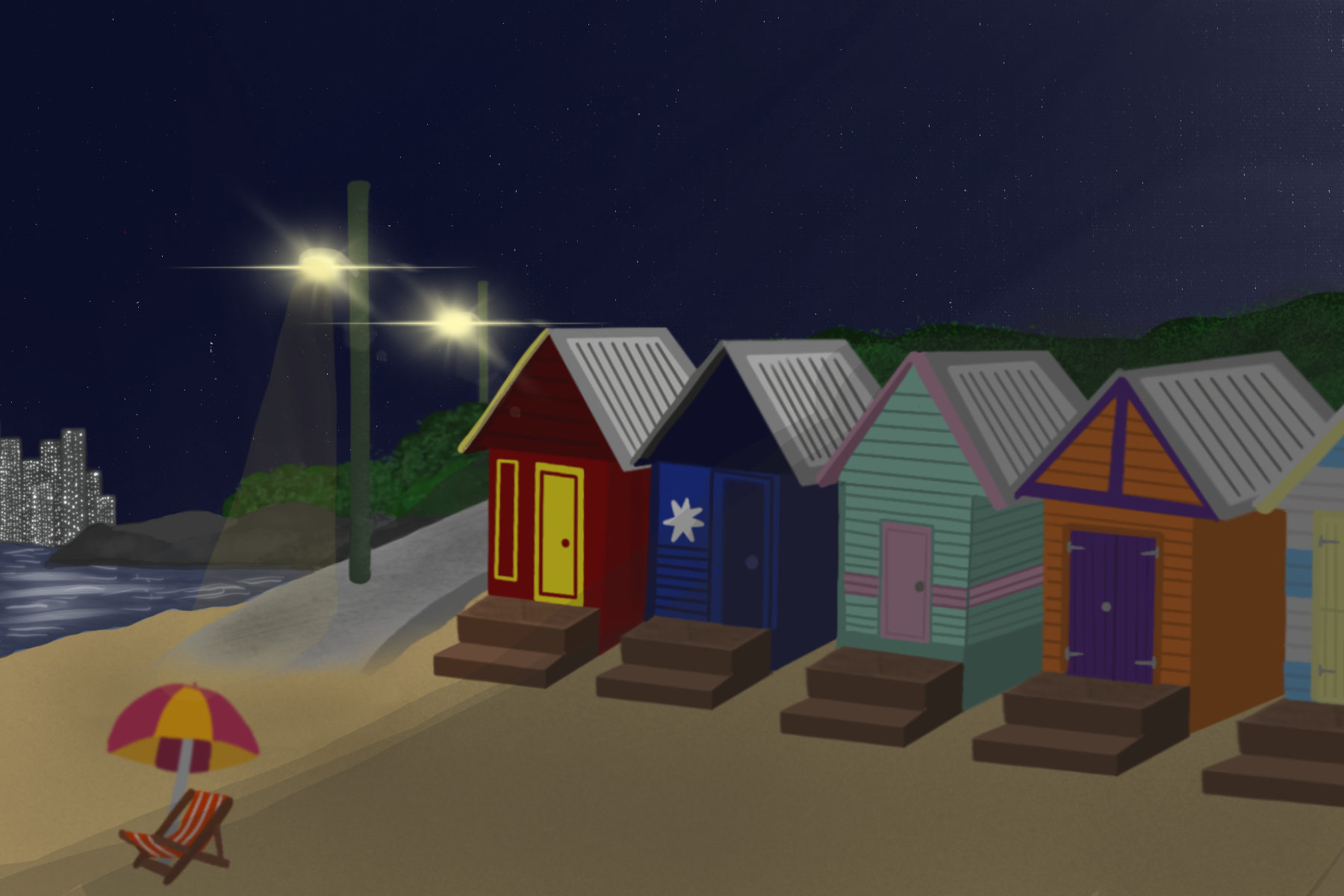 This illustration set reimagines Melbourne’s iconic Brighton Beach bathing boxes in two contrasting moods - the vibrant energy of a sunny afternoon and the calm serenity of nightfall.