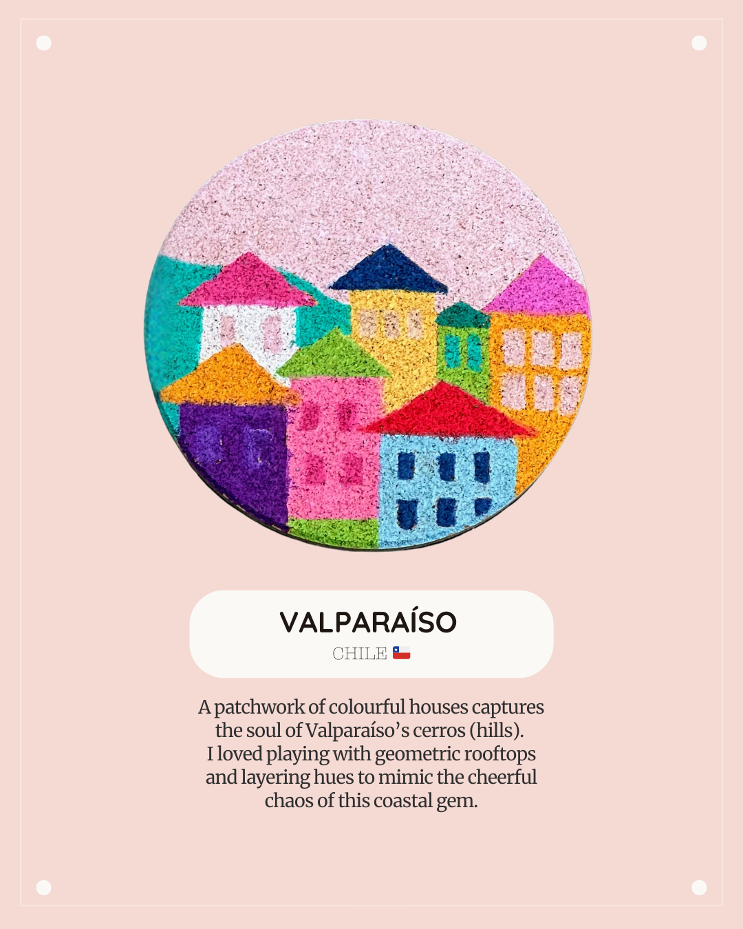 Valparaíso - A joyful patchwork of colourful hillside houses, layered in geometric rooftops to reflect the cheerful chaos of this coastal city.