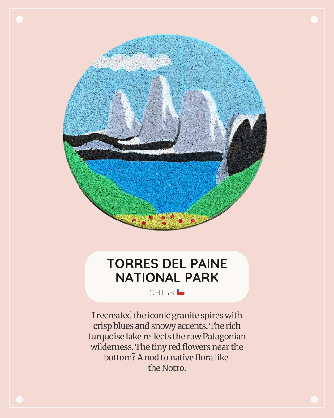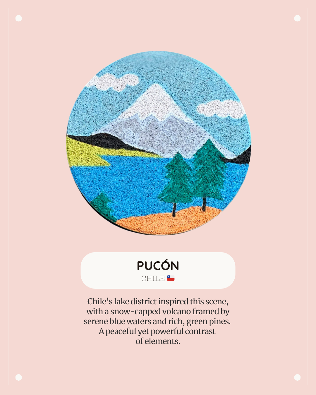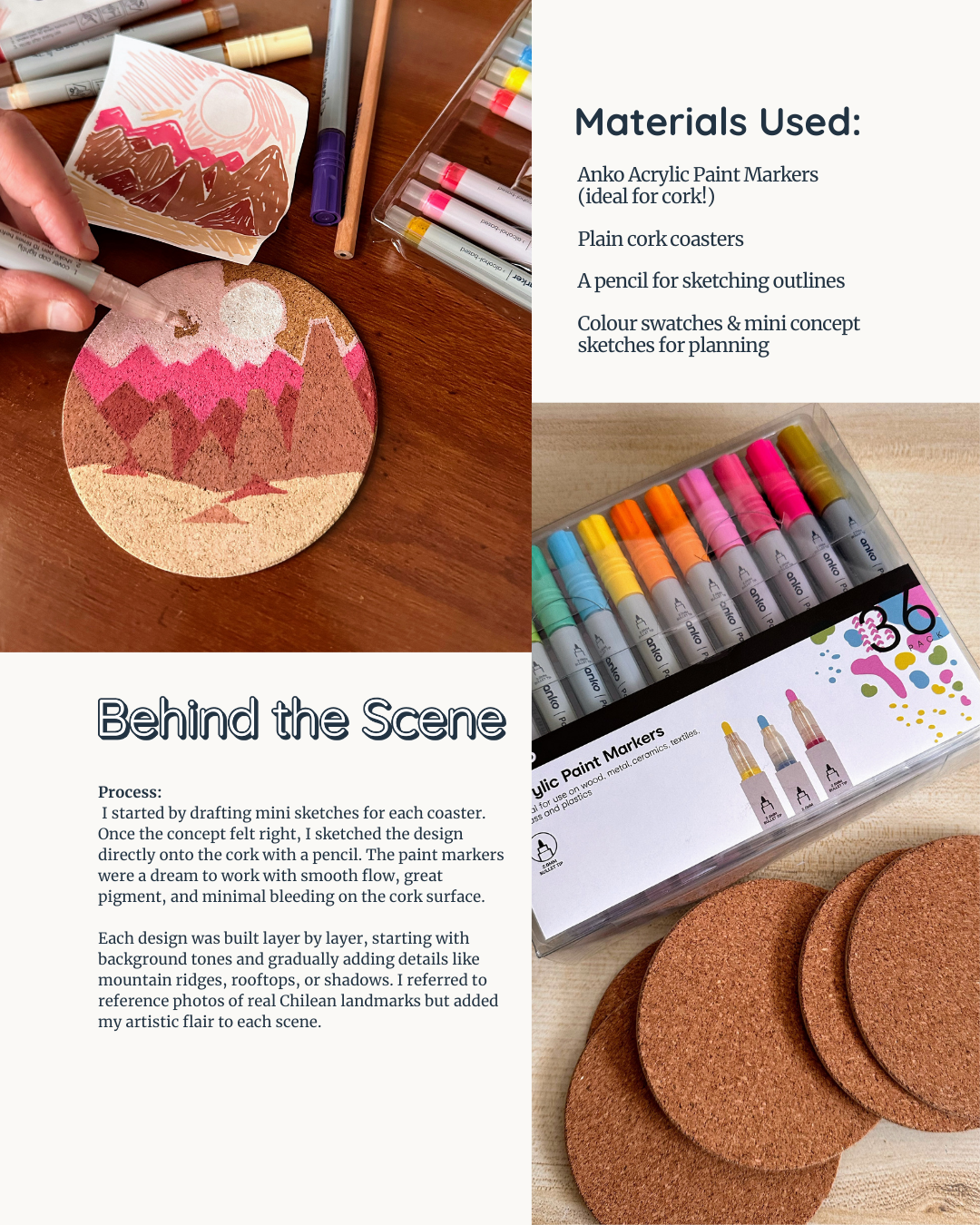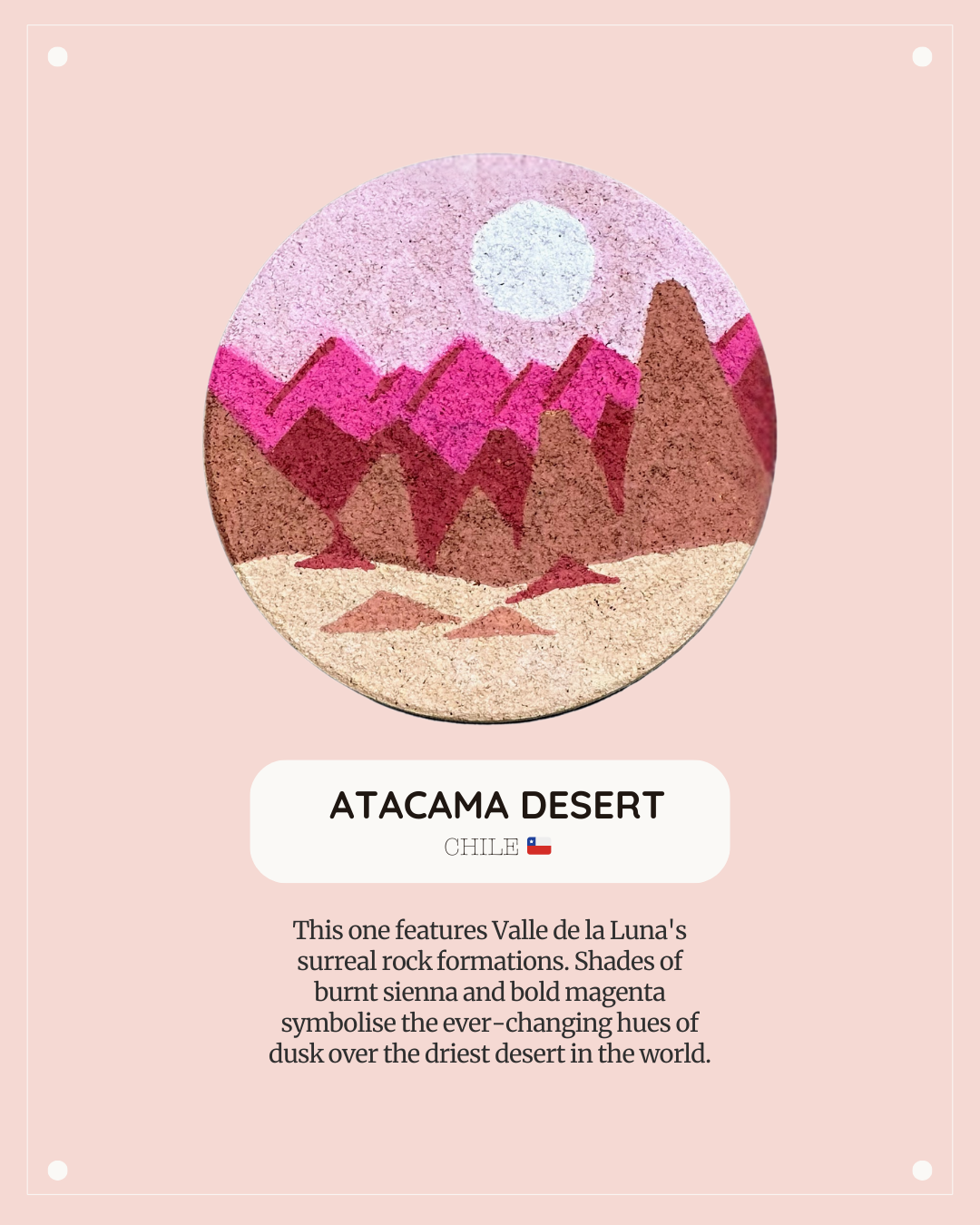 This set of handcrafted coasters transforms Chile’s diverse landscapes into bold, graphic miniatures. Using acrylic paint markers on cork, I recreated four iconic Chilean scenes - each distilled into simple, vibrant shapes that capture the spirit of place.