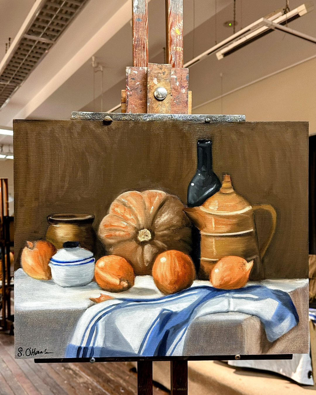 This still life captures the warmth and simplicity of everyday objects - a rustic pumpkin, onions, ceramic jars, and a striped cloth draped across the table. Layer by layer, the painting builds from an earthy underpainting into rich, glowing tones that bring depth and realism.